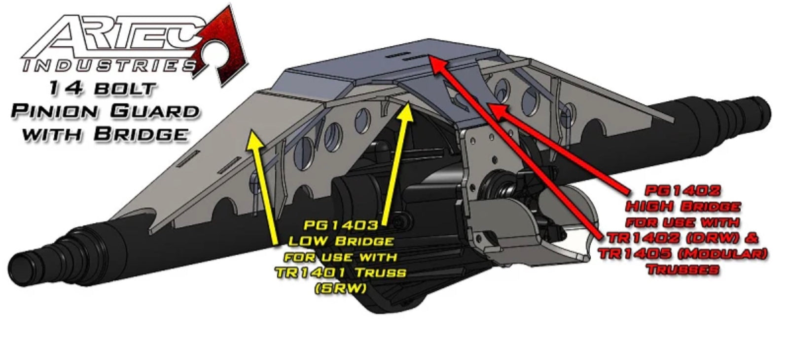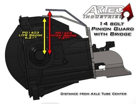 Artec Industries 14 bolt Pinion Guard is designed to keep your vulnerable pinion out of the rocks and Inch one piece. CNC cut from 3/8 inch thick mild steel, this guard is meant to take the worst you and the rocks can dish out. Included bridge to connect to your Artec 14 bolt truss. Bridge is CNC cut and formed from 1/4 inch thick mild steel and adds rigidity to your existing truss. Bridge bolts on to pinion guard and welds to truss.