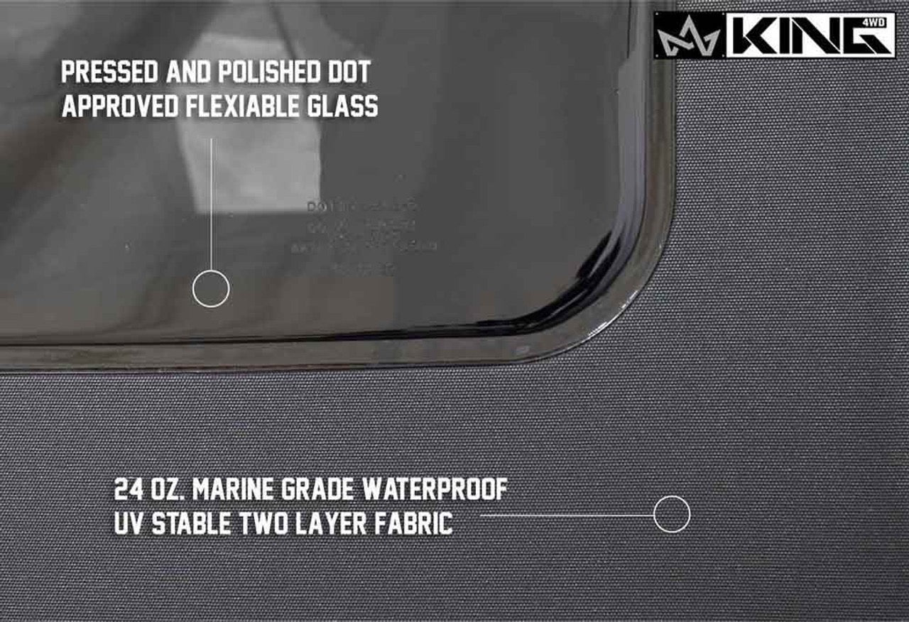 Premium Replacement Soft Top for Your Jeep Wrangler JKU: If your Jeep Wrangler’s JKU Soft Top has seen years of beatings and extreme driving conditions, it is time to replace the Soft Top. King 4WD Premium Replacement Soft Tops are developed with the most comprehensive engineering standards & requirements typically used for Original Equipment Manufacturers. Each aspect of the King 4WD Replacement Soft Top has that extra step of detail done to ensure that your Replacement Soft Top will hold up to the harshest conditions, last the longest, fit the best and outperform any other Replacement Soft Top you are considering. King 4WD Jeep Replacement Soft Top specifications on materials, thickness, weight, UV rating, glass, Velcro, and stitching has been specked and evaluated to meet or beat all Original Equipment standards.