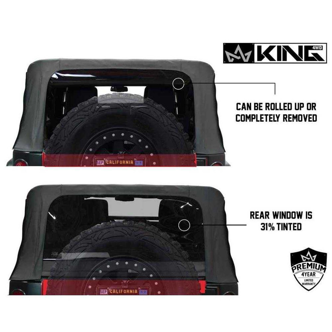 Questions: Will this work with my Jeep that has a Hard Top?Answer: No this top will not work if your Jeep only has a hard top. You need factory hardware which includes door surrounds, windshield channel, tailgate bar, tailgate bar clips, and bow assembly Question: Will this top fade?Answer: this top uses a premium marine grade two layer fabric that has passed an accelerated aging test of over a 1000 hours which equates to over 5 years before discoloration Question: Will this top fit with half steel doors?Answer: This top will fit with half steel doors, however, the upper doors are not included. Question: Will this fit my Jeep Wrangler X, Sport, SE, Sahara, Rubicon?Answer: This will fit any Jeep Wrangler Unlimited 4 Door 2007 to 2009 Classified as a JK Question: Will this top crack in cold temperature?Answer: The composition of this material has operating properties below -40 degrees without deformation of the material Question: How tinted are the windows?Answer: Our rear window and side curtains are 31% tinted Question: Does the side windows or rear windows have straps?Answer: The top has straps to hold your windows once rolled up. Questions: Does my rear window or side curtains come out?Answer: Yes your curtains and rear window can be completely removed Question: Does my top flip back?Answer: Yes your top flips back just like it original factory topKing 4WD is a Division of Overland Vehicle Systems. Overland Vehicle Systems is the Leader in Hard Sided Roof Top Tents, Soft Sided Roof Top Tent, 270 Awnings, 180 Awnings, Pull Out Awnings, Recovery Gear, Air Management, Dry Storage Boxes, Camp Kitchens, Seat Covers for Jeeps, Floor Liners for Jeeps, Replacement Soft Tops and Camping Equipment.