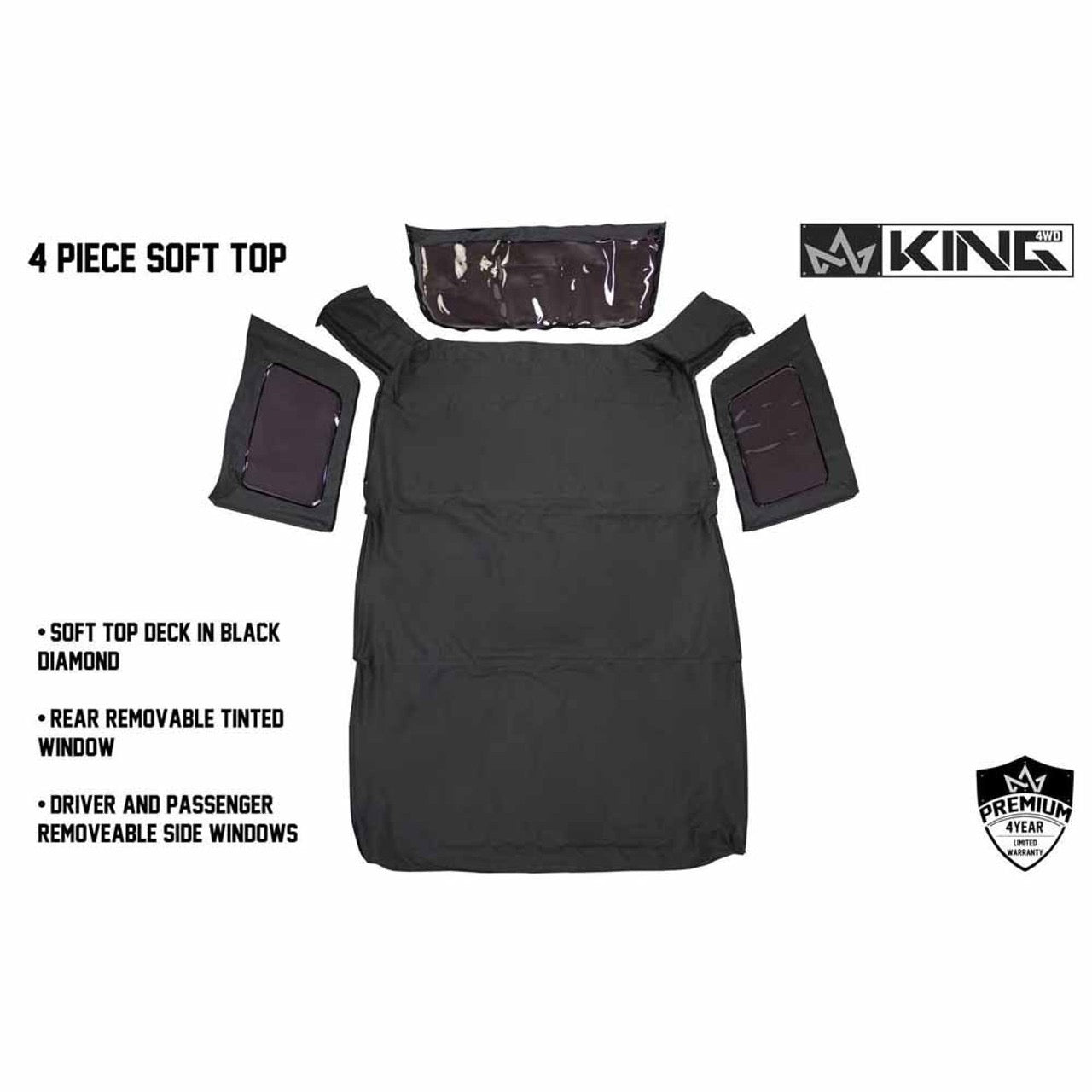 Four-Year Limited Warranty: King 4WD Replacement Soft Top comes with a 4 Year Limited Warranty. King 4WD warranty includes coverage for products with manufacture defects in materials and workmanship. Coverage does not include products with a color mismatch.